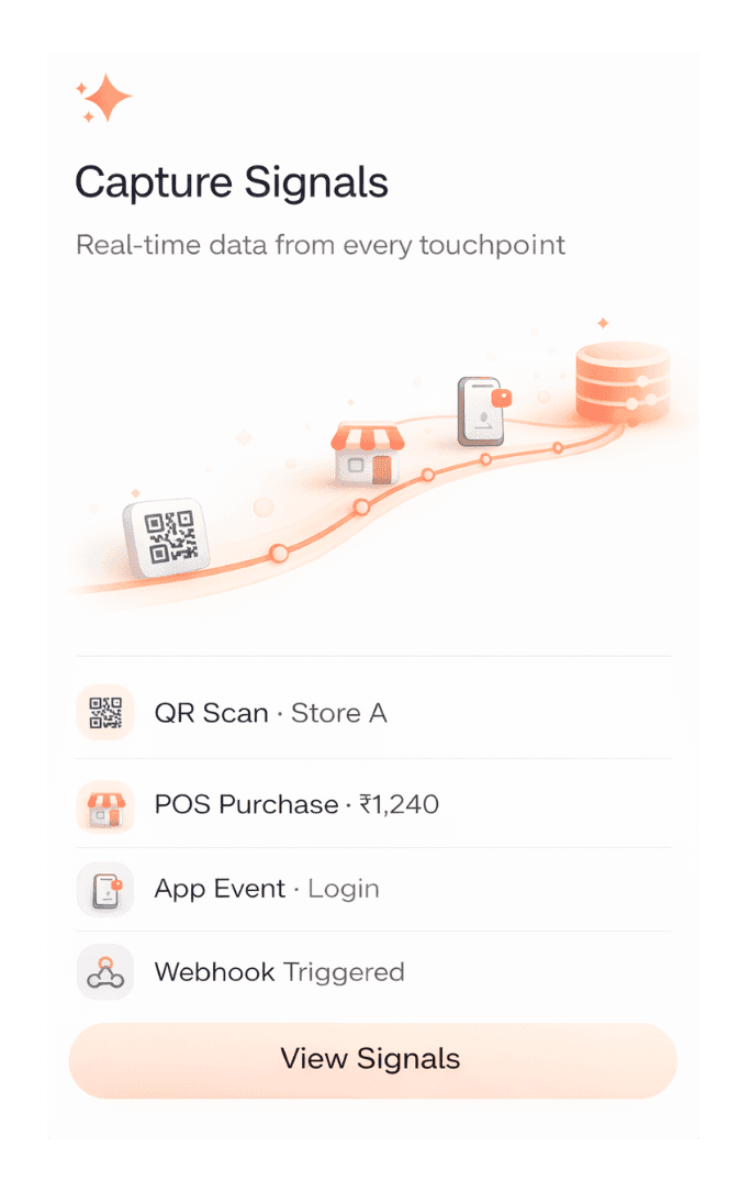 QR scans, store visits, purchases, app events, camera feeds — every interaction captured and tied to a unified customer profile in real time.